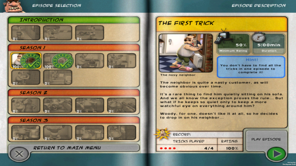 Для начала стоит изучить стереотипы поведения хозяина дома, проследить за его перемещением, после чего спланировать поэтапно свои действия, выбирая наиболее удачное время для очередной ловушки. В распоряжении геймеров будет большое количество интерактивных элементов, таким образом можно перемещаться по всей квартире, заходить в каждую комнату, заглядывать в шкафы и углы, чтобы отыскать различные предметы, которые можно будет использовать для реализации пакостей. Также не стоит пренебрегать своевременным побегом с поля зрения соседа, можно спрятаться в шкаф или других комнатах. Чем меньше будут промежутки времени между шалостями, тем хуже будет настроение старика, и больше очков можно будет заработать.