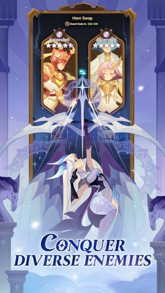 - Сражения происходят в автоматическом формате, однако можно вручную включать особые навыки героев.